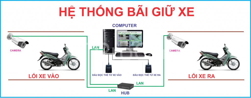 - Lối xe vào: nhân viên bãi xe quẹt thẻ và đưa cho người gửi xe. Trong quá trình này camera chuyên dụng sẽ chụp hình biển số xe và hình ảnh người gửi đưa về phần mềm quản lý và lưu trữ vào một file riêng trên máy tính